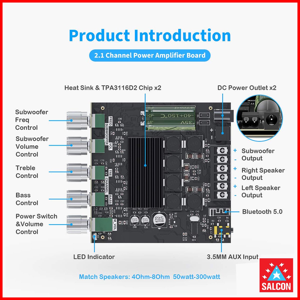 The Salcon TB-21 Audio Amplifier 2.1 is a compact yet powerful Class-D amplifier designed to deliver immersive surround sound with deep bass and crystal-clear stereo output. Powered by the advanced TPA3116D2, this amplifier provides a strong 50W + 50W stereo output along with a dedicated 100W subwoofer channel, making it ideal for 2.1 channel speaker systems. With a wide working voltage range of DC 12V–24V, it is highly versatile and compatible with 4–8Ω speakers ranging from 50W to 300W, suitable for both home audio and DIY sound setups